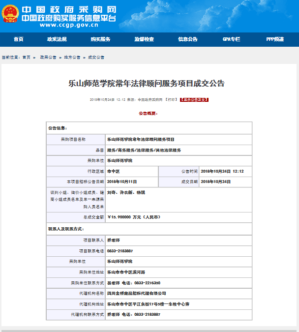 上一条:乐山师范学院电梯维保项目成交公告 下一条:乐山师范学院审计服务项目废标公告/流标公告