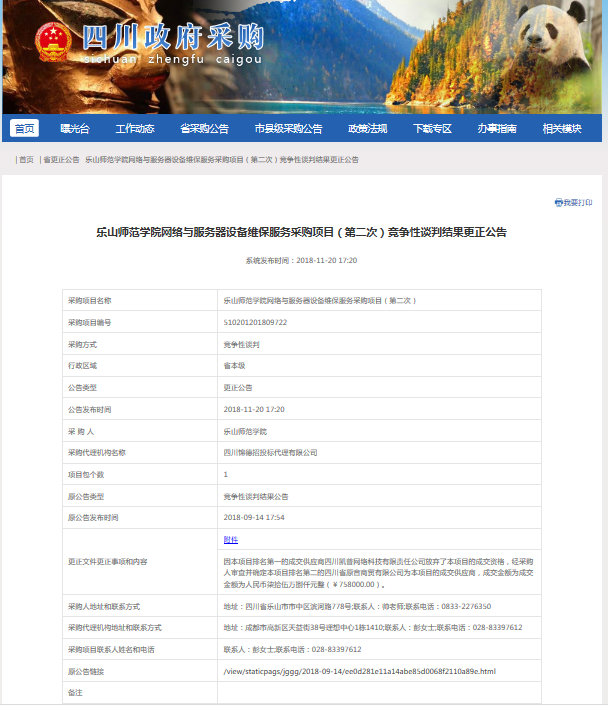 该谈判结果更正公告于2018年11月20日在四川政府采购网发布,发布网址: