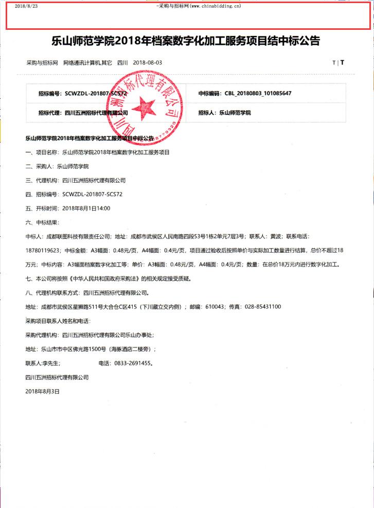 乐山师范学院2018年档案数字化加工服务项目中标公告