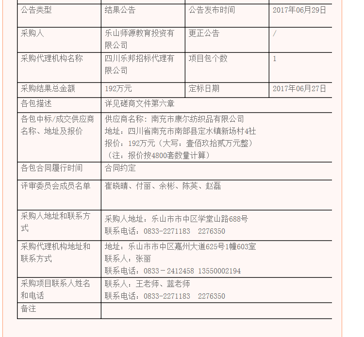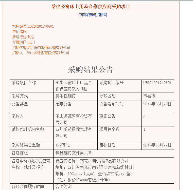 乐山师源教育投资有限公司学生公寓床上用品合作供应商采购项目采购结果公示