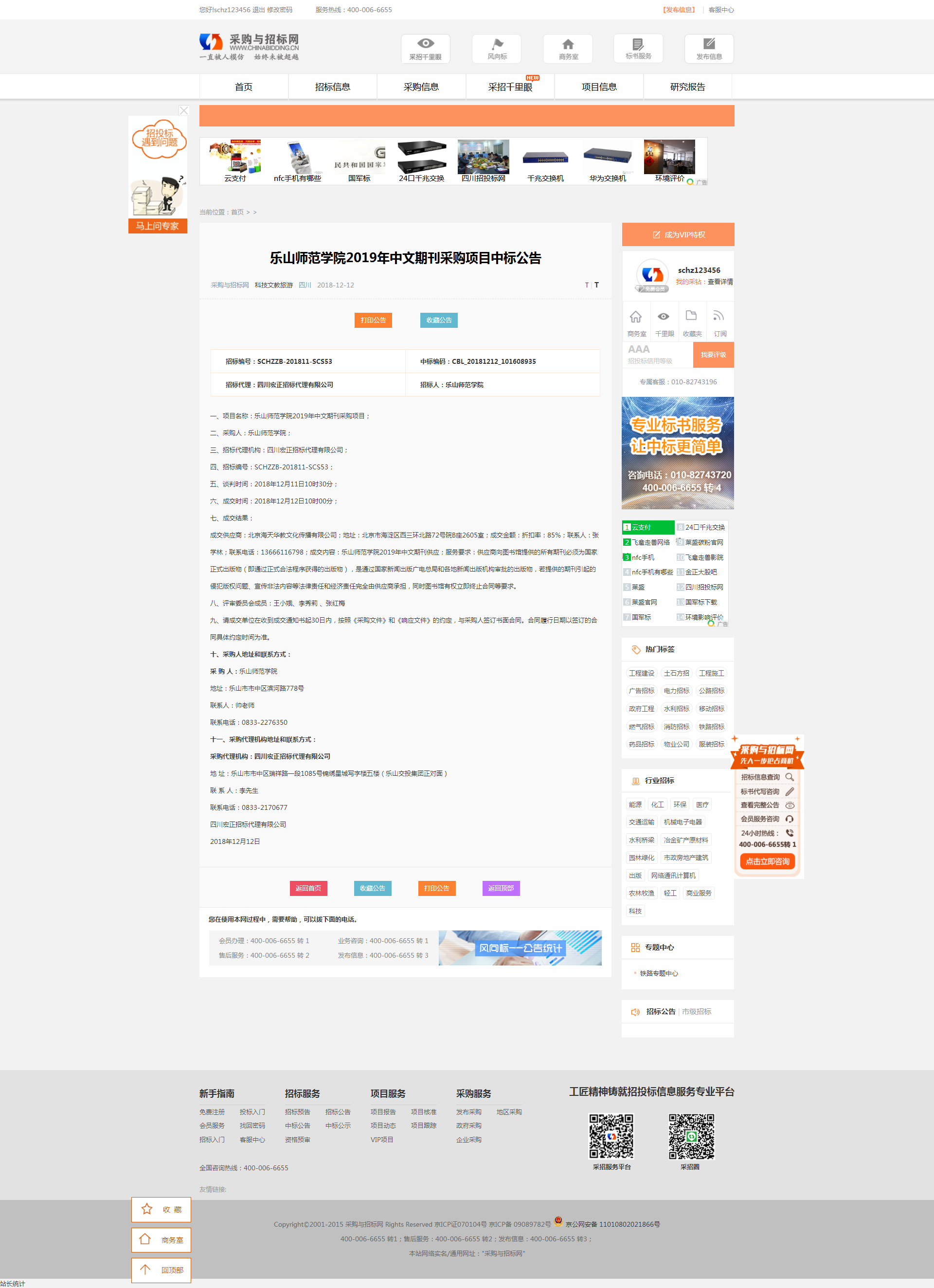 乐山师范学院2019年中文期刊采购项目中标公告