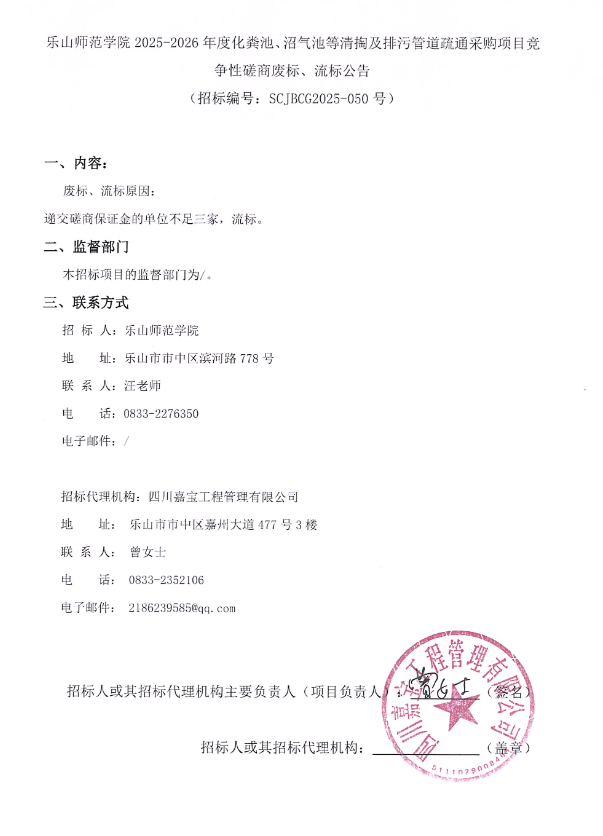 乐山师范学院2025-2026年度化粪池、沼气池等清掏及排污管道疏通采购项目竞争性磋商废标、流标公告