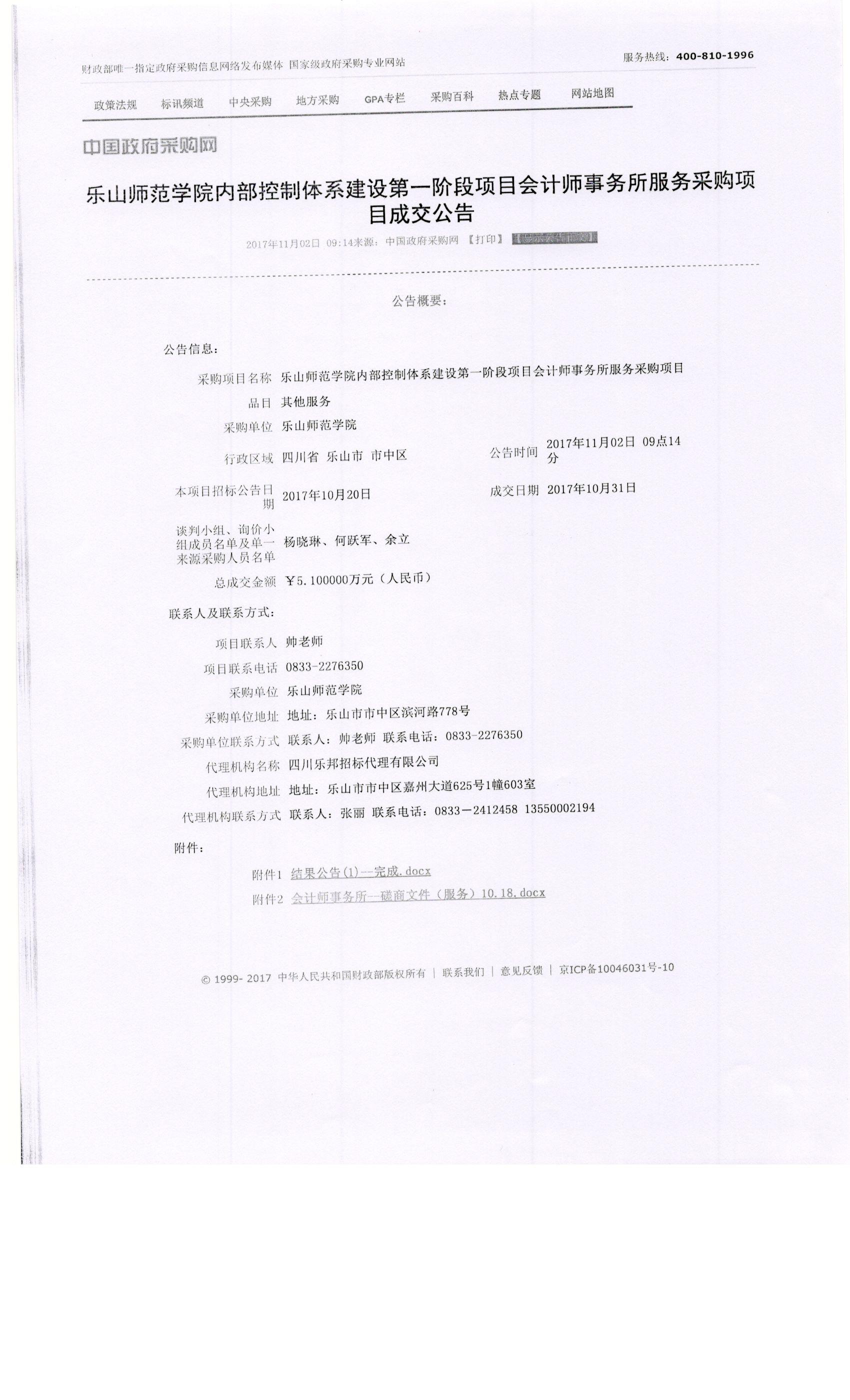 乐山师范学院内部控制体系建设第一阶段项目会计师事务所服务采购项目成交公告